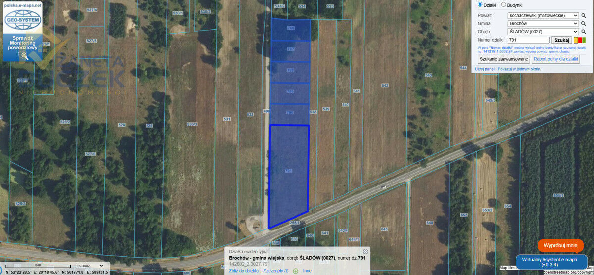 Sprzedam działki w miejscowości Śladów, w gminie Brochów.Działki znajdują się bezpośrednio przy drodze publicznej. Przy pierwszej działce znajduje się prąd i kanalizacja, woda znajduje się około 400 m od działek, więc ekonomiczne rozwiązanie stanowi założenie własnej studni. Właściciel działek jest w trakcie uzyskiwania warunków zabudowy dla każdej działki z osobna.